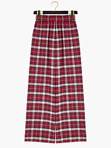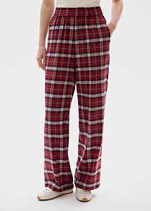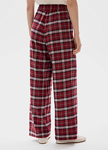 Брюки в клетку в бордовом оттенке.