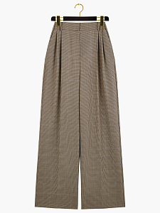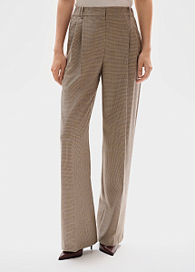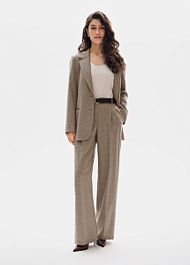 Костюмные брюки из шерсти в бежевом оттенке в клетку. Прямой силуэт с притачным поясом подчеркивает талию и обеспечивает безупречную посадку. Универсальная модель для деловых и повседневных образов. Идеально сочетаются с жакетом и жилетом из аналогичной ткани.