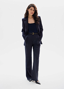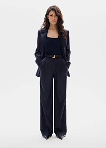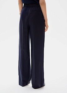 Костюмные брюки из шерсти в глубоком сапфировом оттенке в тонкую полоску. Прямой силуэт с притачным поясом подчеркивает талию и обеспечивает безупречную посадку. Универсальная модель для деловых и повседневных образов. Идеально сочетаются с жакетом и жилетом из аналогичной ткани.