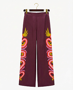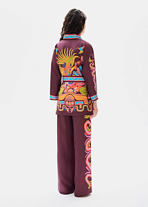 Прямые брюки из натурального шелка сливового цвета с авторским принтом «Кетцалькоатль». Модель с широким эластичным поясом и карманами. Рекомендуем сочетать с кимоно из аналогичной ткани.