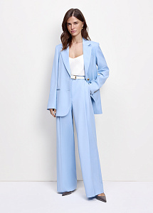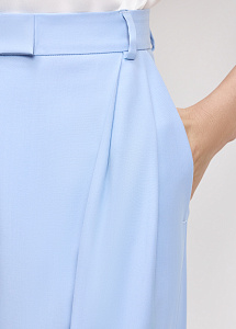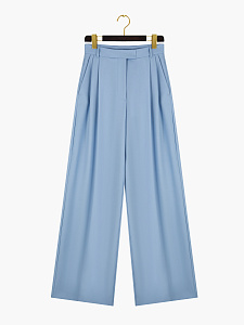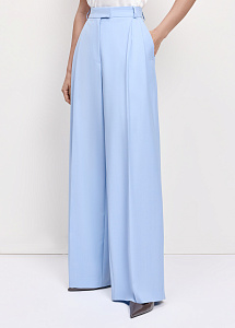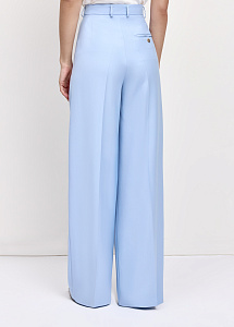 Брюки-палаццо из шерсти в нежном голубом цвете с высокой посадкой и поясом. Модель широкого кроя с защипами и карманами. Рекомендуем сочетать с жакетом из аналогичной ткани.