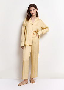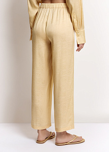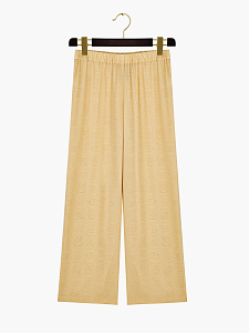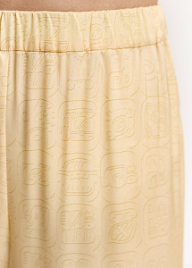 Укороченные брюки из шёлка нежно-жёлтого оттенка с авторским принтом, вдохновлённым древним письмом цивилизации Майя. Модель с эластичным поясом и боковыми карманами обеспечивает идеальную посадку и комфорт.