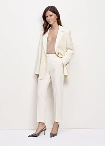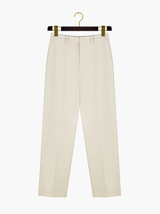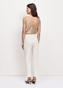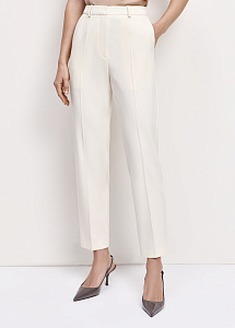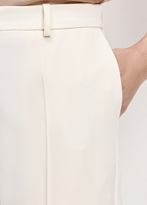Молочные узкие брюки из шерсти со стрелками. Модель с отрезными карманами по бокам, прорезными карманами с листочкой и поясом с эластичной вставкой. Классический крой для строгого силуэта. Рекомендуем сочетать с жакетом из этой же ткани.