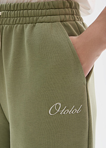 Трикотажные брюки из хлопка с эластичным поясом и манжетами в оливковом оттенке. Идеально сочетаются с худи и джемпером из аналогичной ткани. Оптимальная длина брюк для роста до 172 см.