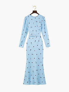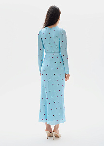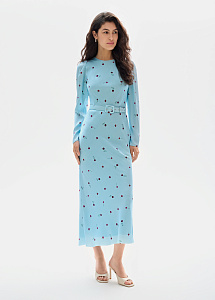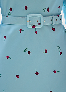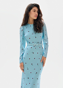 Платье из натурального шёлка благородного лазурного оттенка с принтом "георгины". Модель выполнена на подкладке из нежного шёлка и дополнена поясом, мягко акцентирующим талию.