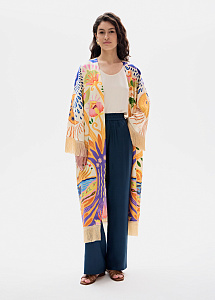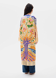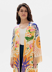 Платье-кимоно из шёлка с авторским принтом и отделкой бахромой по низу рукавов и подолу. Модель можно использовать для расслабленных городских образов, сочетая с топами, джинсами и брюками, а также носить на отдыхе как платье или накидывать поверх комбинаций и купальников.