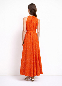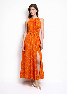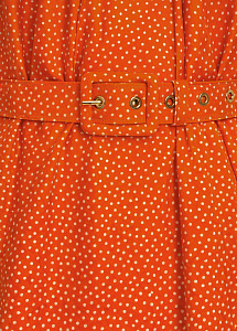 Шёлковое платье в длине миди в ярком оранжевом цвете в белый горошек. Свободный силуэт, разрезы на юбке, ремень в тон подчеркивает линию талии.