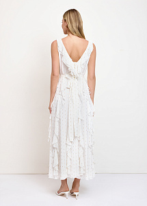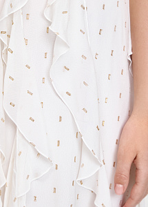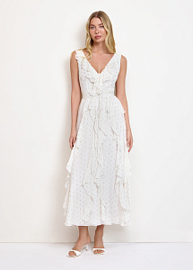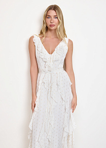 Платье из струящейся вискозы в молочном цвете. Модель прилегающего силуэта, с V-образным вырезом, воздушными оборками по юбке и поясом. Платье дополнено шелковой подкладкой.