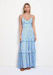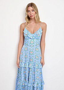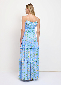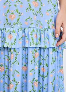 Платье из натурального шёлка с принтом "Пылающее сердце". Модель прилегающего силуэта с лифом на тонких бретелях и трехъярусной юбкой с воланами.