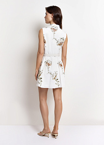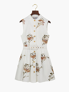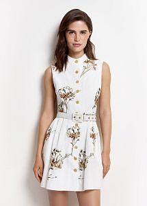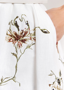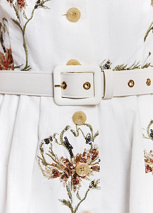 Платье-мини прилегающего силуэта из хлопка и льна молочного оттенка с пайетками и цветочной вышивкой. Модель с округлой горловиной, застежкой и шелковой подкладкой для безупречного комфорта.