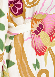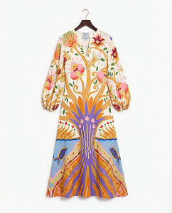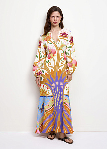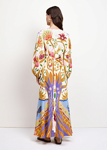 Вискозное платье макси свободного кроя с воланом на юбке и длинными широкими рукавами на резинке. Модель дополнена вырезом-капелька и поясом.