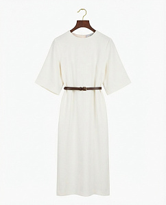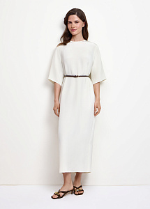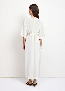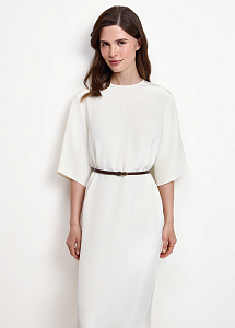 Прямое платье свободного силуэта из 100% натурального шёлка с короткими рукавами. В комплекте тонкий пояс, мягко подчёркивающий талию.