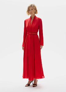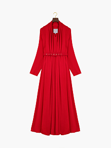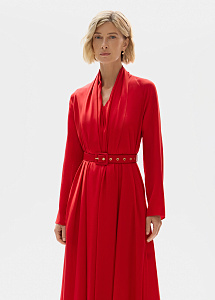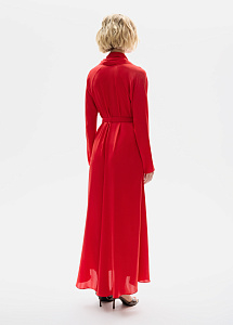 Шелковое платье миди в алом оттенке. Расклешенный силуэт с ремнем мягко подчеркивает талию, а рукава реглан и воротник-шарф добавляют динамики образу. Универсальная модель для городских прогулок и вечерних мероприятий.