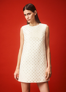 Элегантное платье-футляр сливочного цвета из костюмной шерсти с изысканной вышивкой из пайеток и бисера. Лаконичный силуэт с округлой горловиной и длина мини, идеально для вечерних мероприятий и торжественных случаев.