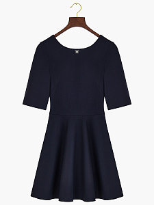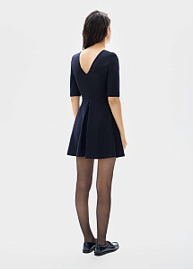 Элегантное платье в длине мини из темно-синей шерсти с V-образным вырезом на спине. Приталенный силуэт и рукава три четверти создают образ, подходящий как для деловых, так и для вечерних мероприятий.