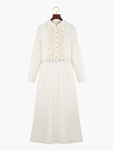 Элегантное платье средней длины с прилегающим лифом и расклешенной юбкой из молочной костюмной шерсти. Модель с манишкой, декорированной рюшами, длинными рукавами и шелковой подкладкой для безупречного комфорта.