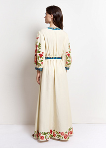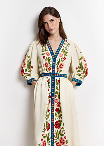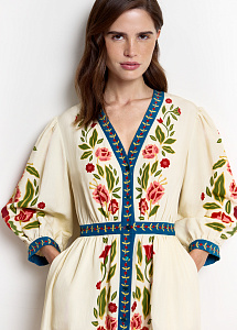 Платье в длине макси изо льна и вискозы с авторским принтом "Колибри и розы", символизирующим любовь, удачу и постоянное движение. Модель дополнена застёжкой на пуговицы, поясом и объёмными рукавами, которые придают силуэту лёгкость и мягкую выразительность.