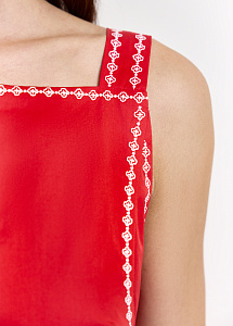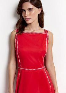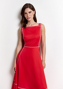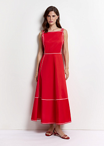 Платье миди из 100% хлопка в насыщенном красном цвете. Модель приталенного силуэта с расклешенной юбкой украшена вышивкой древнего символа из алфавита цивилизации Майя, который обозначает слово "звезда".