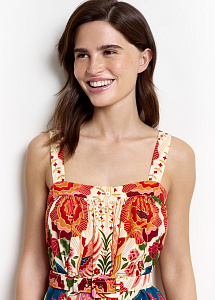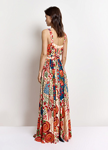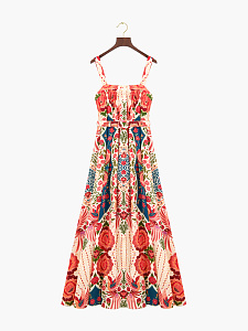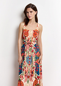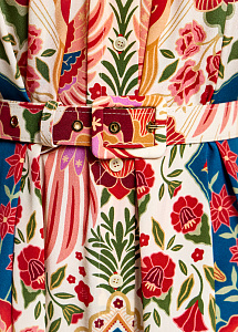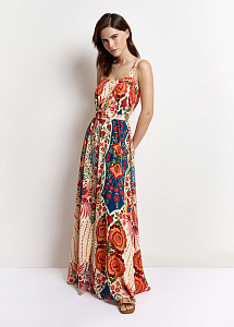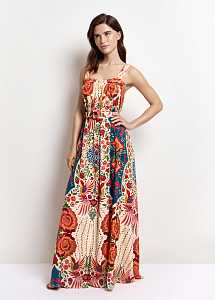 Длинное платье свободного силуэта из струящегося шёлка на широких бретелях с авторским принтом "Колибри и розы", символизирующим любовь, удачу и постоянное движение. Модель на центральной застёжке на петли и пуговицы и дополнена поясом, мягко подчеркивающим талию.