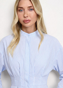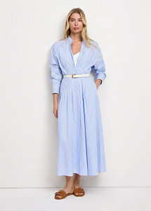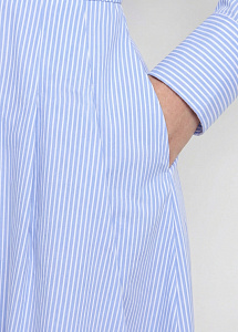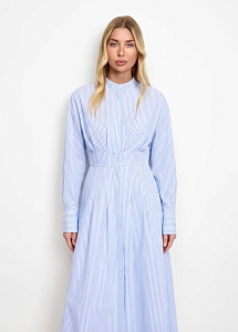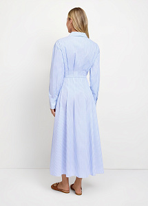 Длинное платье из натурального хлопка в голубом цвете в полоску. Модель приталенного силуэта , со складками по лифу и юбке, длинными рукавами с манжетами, воротником-стойкой и застежкой на петли и пуговицы.