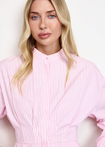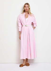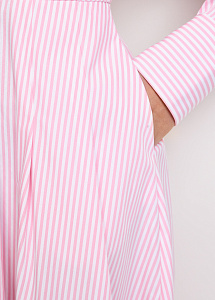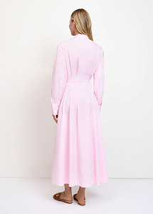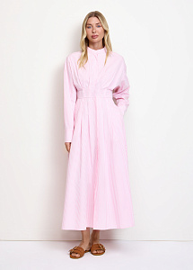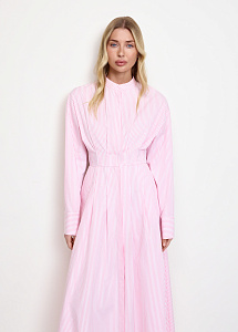 Длинное платье из натурального хлопка в розовом цвете в полоску. Модель приталенного силуэта, со складками по лифу и юбке, длинными рукавами с манжетами, воротником-стойкой и застежкой на петли и пуговицы.