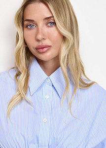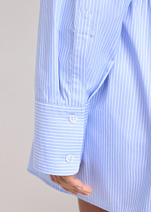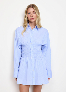 Короткое платье из натурального хлопка в голубом цвете в полоску. Модель прилегающего силуэта, с широким эластичным поясом по талии, длинными рукавами на манжетах и отложным воротником.