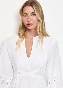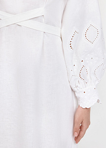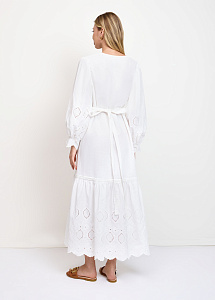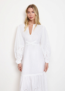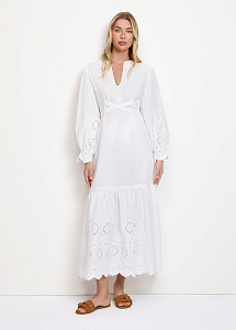 Длинное платье из хлопка и льна с вышивкой ришелье. Модель свободного силуэта с воланом по низу юбки, длинными рукавами на резинке, разрезом-капелькой и полупоясами. Платье станет идеальным выбором для летних дней в городе или отпуска.