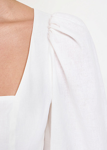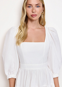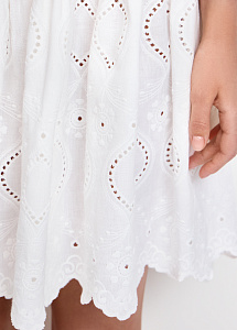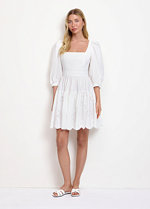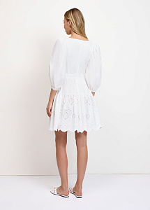 Короткое платье из хлопка и льна с вышивкой ришелье. Модель с воланом на юбке, приталенным лифом и воздушными сосборенными рукавами на манжетах. Платье станет идеальным выбором для летних дней в городе или отпуска.
