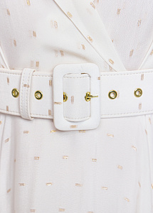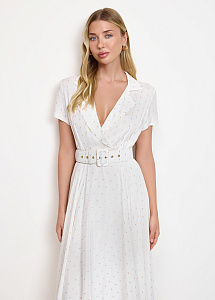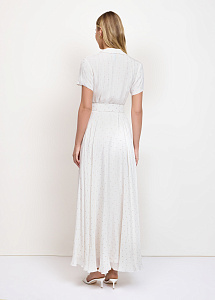 Длинное вечернее платье из струящейся вискозы в молочном цвете. Модель с лифом на запах, коротким рукавом и поясом, на шелковой подкладке.