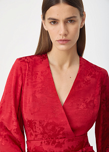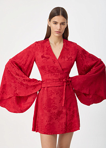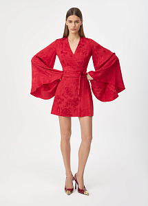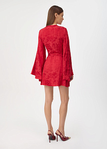 Красное мини-платье на запах с летящим силуэтом из жаккарда с изысканным узором "розы". Широкие рукава и расклешенный подол подчеркивают динамику движения, создавая ощущение легкости и утонченной женственности.