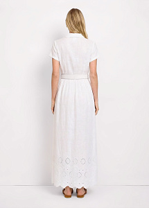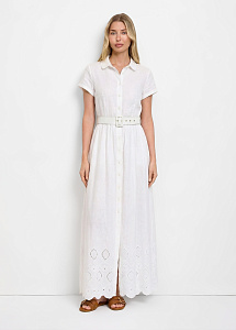 Длинное платье из хлопка и льна с вышивкой ришелье. Модель полуприлегающего силуэта, с короткими рукавами, отложным воротником-стойкой и застежкой на петли и пуговицы. В комплекте обтяжной ремень. Платье станет идеальным выбором для летних дней в городе или отпуска.