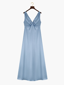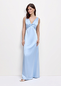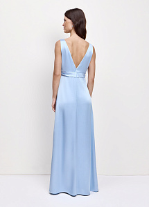 Шелковое платье макси в нежном голубом оттенке. Модель с V-образным вырезом, мягкой драпировкой на груди и скрытой застёжкой-молнией на спинке создаёт элегантный, романтичный образ. Платье прекрасно подойдет для вечерних выходов и особых случаев.