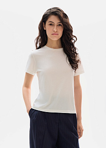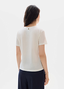 Футболка из лиоцелла и хлопка в молочном оттенке. Свободный силуэт из мягкой ткани «эвкалиптовый шёлк» с благородным матовым сиянием. Универсальная базовая модель легко сочетается с денимом, брюками и юбками из нашей коллекции.