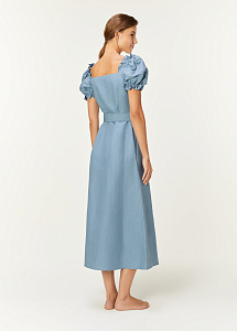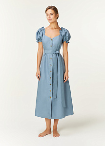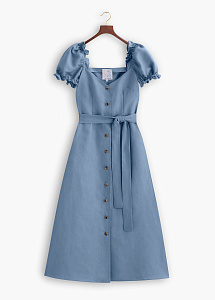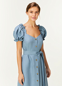 Платье средней длины, прилегающего силуэта, с коротким рукавом "фонариком", с глубоким каре-образным вырезом по спинке и переду, с карманами в боковых швах, с центральной сквозной застежкой на петли и пуговицы, с поясом.