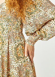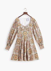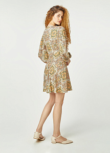 Платье короткое, полуприлегающего силуэта, с сосборенным подрезом под грудью, с втачным поясом по спинке, с расширенной к низу юбкой, с длинными рукавами на манжетах, с застежкой по спинке на потайную молнию.