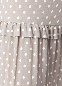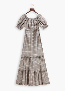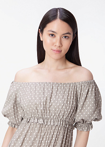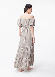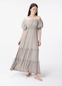 Платье длинное, свободной формы, с подрезом под грудью, с двумя воланами по низу, с короткими рукавами со сборкой на эластичную тесьму по низу. Горловина формы "кармен", сосборена на эластичную тесьму. Платье частично на подкладке.