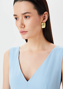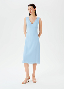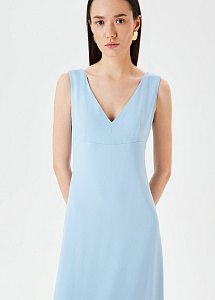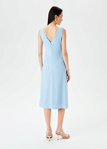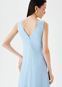 Платье ниже колена в небесно-голубом оттенке, изготовленное из смесового материала. Ацетат хорошо держит форму и устойчив к сминанию, а за счёт добавления вискозы ткань обладает высоким уровнем гигроскопичности. Лиф с V-образным вырезом комфортно облегает фигуру. Юбка расширяется к низу и не сковывает движения. В качестве подкладки использован эластичный гладкий шелк.