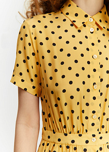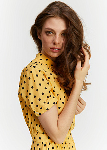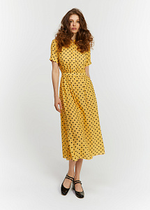 Платье средней длины в терракотовом оттенке с гороховым принтом по всей поверхности изделия. Выполнено из натурального гладкого шелка. Лиф прилегающего силуэта с короткими рукавами и отложным воротником на небольшой стойке. Юбка свободного кроя декорирована сборкой по линии талии и дополнена карманами. Платье застегивается на пуговицы в тон по всей длине.
