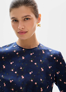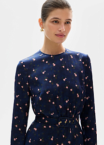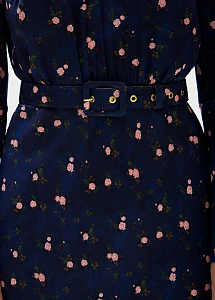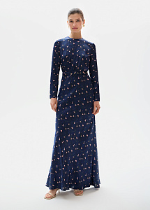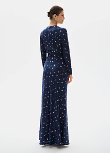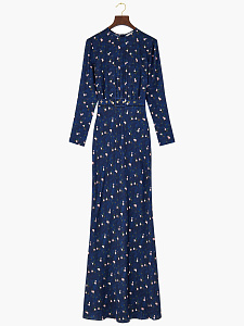 Шелковое платье макси в темно-синем оттенке с принтом «розы». Прилегающий крой и пояс подчеркивают утонченный силуэт. Идеальный выбор для особых мероприятий.