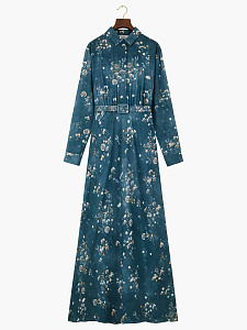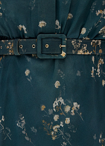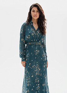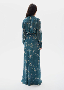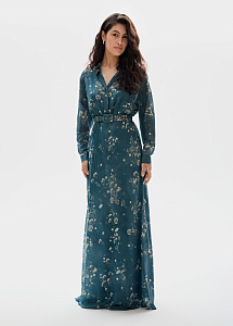 Вечернее платье из шёлка в изумрудном оттенке с цветочным принтом «полевые цветы». Расклешенный силуэт с рубашечным верхом на пуговицах, карманами и ремнём, мягко подчеркивающим талию.