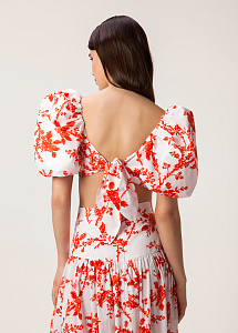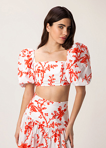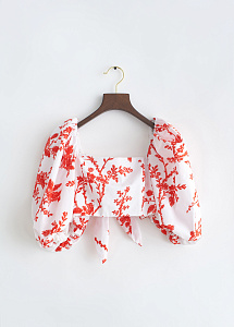 Укороченный топ прилегающего силуэта, с рельефами по переду, завязывающимся бантом по спинке. На подкладке. Вырез горловины - каре.