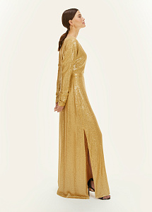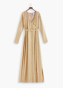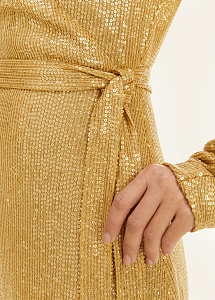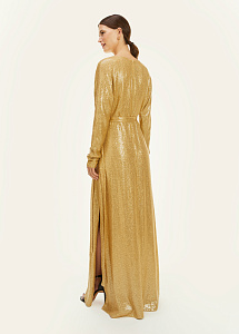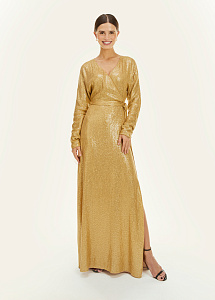 Вечернее платье, расшитое мелкими золотыми пайетками. Платье на запах с рукавами свободного кроя. Завершить вечерний образ рекомендуем минималистичными босоножками или туфлями-лодочками.