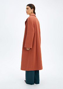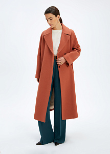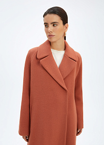 Пальто ниже колена в светло-коричневом оттенке. Изготовлено из теплой шерсти с добавлением полиамида для износостойкости изделия. Крой пальто формирует прямой свободный силуэт. Английский воротник выполнен с закругленными лацканами для более аккуратного внешнего вида. Внутри - гладкая подкладка из вискозы.
