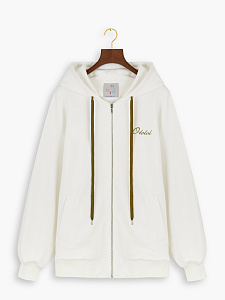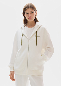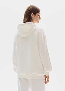 Трикотажный джемпер свободного кроя средней длины в молочном оттенке. Длинные рукава, застёжка на молнию и капюшон создают расслабленный силуэт. Идеально сочетается с брюками из этой же ткани.