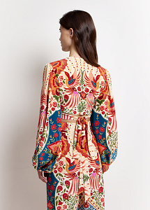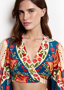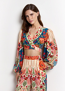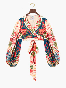 Короткая блузка на запах из струящегося шёлка с авторским принтом ""Колибри и розы"", символизирующим любовь, удачу и постоянное движение. Воздушные рукава со сборкой придают силуэту лёгкость и мягкую выразительность.