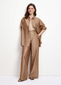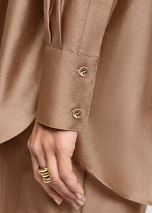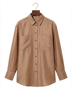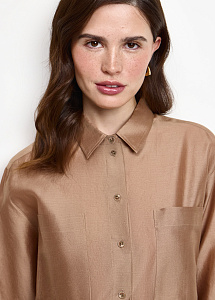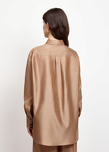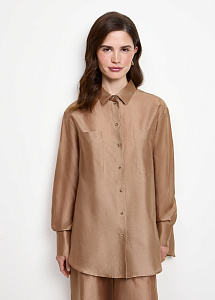 Блузка свободного силуэта из шелка и хлопка. Модель с отложным воротником, накладными карманами, длинными рукавами на манжетах и застёжкой на петли и пуговицы. Рекомендуем сочетать с брюками из аналогичной ткани.