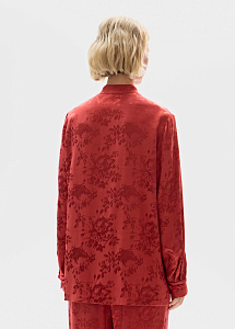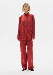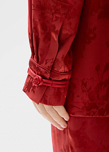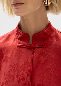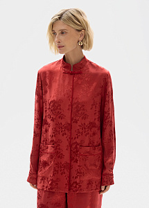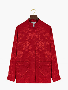 Жаккардовая блуза свободного кроя в насыщенном красном оттенке с восточным силуэтом и изысканным узором «розы». Лаконичный фасон с воротником-стойкой, манжетами и плетёными пуговицами ручной работы. Рекомендуем сочетать с брюками в тон из нашей коллекции.