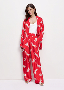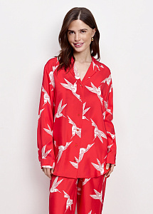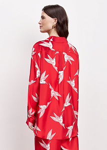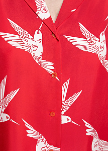 Блузка свободного силуэта из шелка с принтом «колибри». Модель с отложным воротником, длинными рукавами на манжетах, застежкой на пуговицы и разрезами по бокам. Рекомендуем сочетать блузку с брюками из аналогичной ткани.