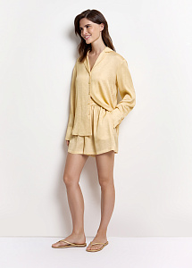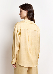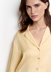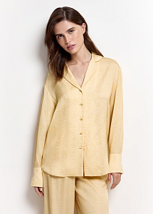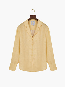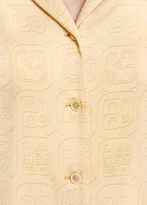 Блузка свободного силуэта из шёлка нежно-жёлтого цвета с авторским принтом, вдохновлённым древним письмом цивилизации Майя. Модель с классическим английским воротником и длинными рукавами на широких манжетах подчёркивает элегантность.