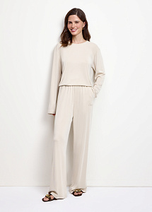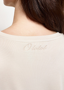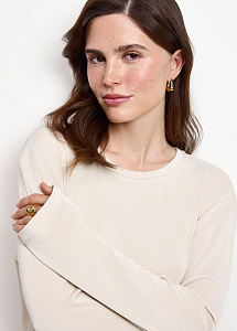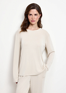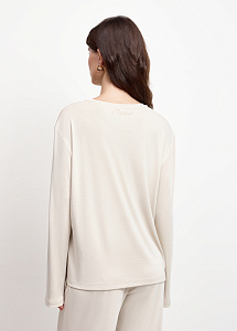Трикотажная футболка в молочном цвете с длинными рукавами. Лаконичная модель для повседневных образов и многослойных комбинаций. Рекомендуем сочетать с брюками из аналогичной ткани.